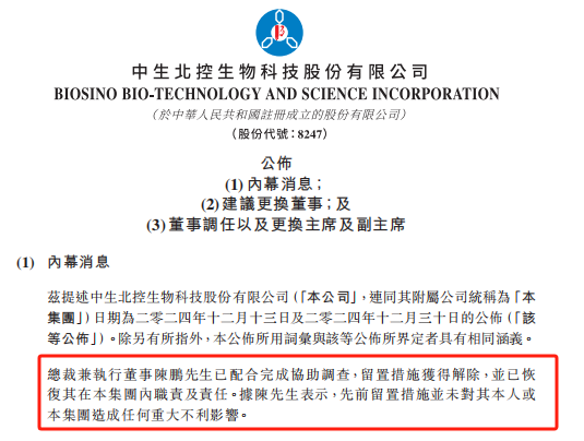 总裁兼执行董事陈鹏先生已配合完成协助调查,留置措施获得解除,并已恢复其在本集团内职责及责任。据陈先生表示,先前留置措施并未对其本人或本集团造成任何重大不利影响。
